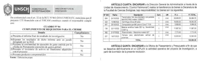 Pese a tener dos años para ejecutarlo y una ampliación posterior, el proyecto nunca fue cerrado. El informe de la Dirección del Instituto de Investigación del 30 de junio de 2025, detalla incumplimientos graves: