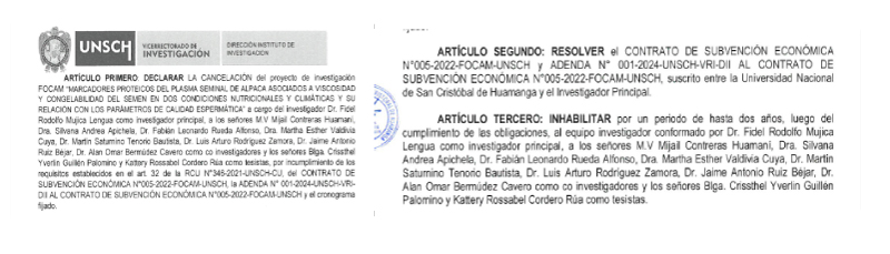 La historia detrás de la palabra “inhabilitación” es ahora pública. Documentos a los que se tuvo acceso revelan que el proyecto FOCAM liderado por Mujica —titulado “Marcadores proteicos del plasma seminal de alpaca asociados a viscosidad y congelabilidad del semen…”— obtuvo un financiamiento de S/ 300 000 mediante la Resolución de Consejo Universitario N.° 005-2022-UNSCH-CU.