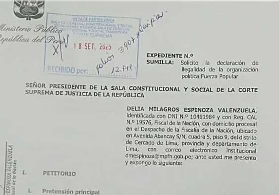 La fiscal de la Nación, Delia Espinoza Valenzuela, ha solicitado formalmente a la Corte Suprema que el partido Fuerza Popular sea declarado ilegal y se proceda con la cancelación de su inscripción en el Registro de Organizaciones Políticas. La medida fue planteada a través de un extenso documento de 364 páginas, presentado este jueves ante la Sala Constitucional y Social del máximo tribunal.