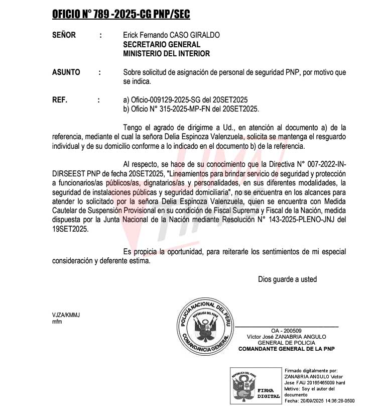 El documento es firmado por Erick Caso Giraldo, secretario del Ministerio del Interior. En el mismo, adjunta el oficio 789 2025-CG-PNP/SEC. Se trata del documento policial donde se informa que la fiscal suspendida Delia Espinoza Valenzuela no contará con resguardo.
