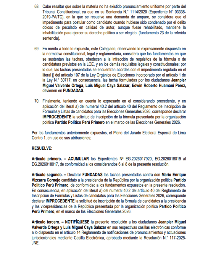 El Jurado Electoral Especial (JEE) de Lima Centro 1 declaró improcedente la inscripción de la fórmula presidencial del partido Perú Primero, encabezada por Mario Vizcarra Cornejo, tras admitir tres tachas que solicitaban su exclusión de las Elecciones Generales 2026 debido a una sentencia por peculado.